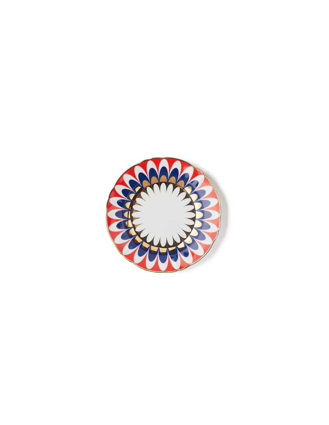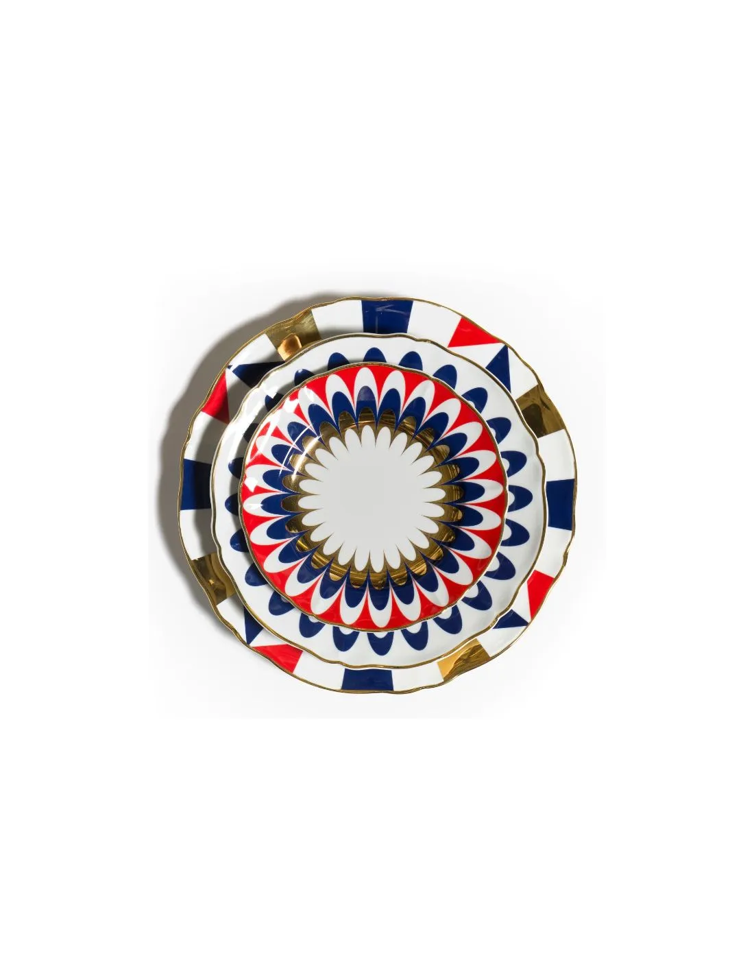 Blanc, bleu, multicolore, doré, porcelaine, motif géométrique, logo imprimé à l’arrière, bordures asymétriques, lavable en lave-vaisselle.