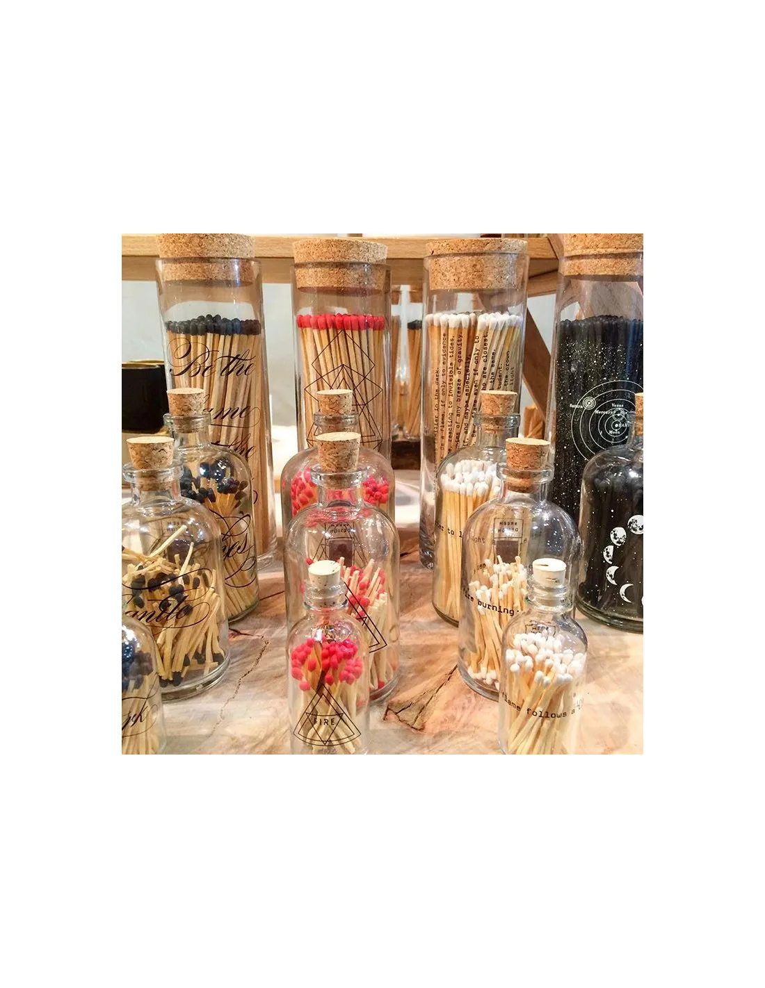 Les allumettes Skeem Design ont un packaging dont le design est unique : une bouteille apothicaire en verre avec un message au fini satiné et un bouchon en liège. Ces jolies bouteilles sont équipées d’un grattoir au dos pour allumer vos allumettes facilement.