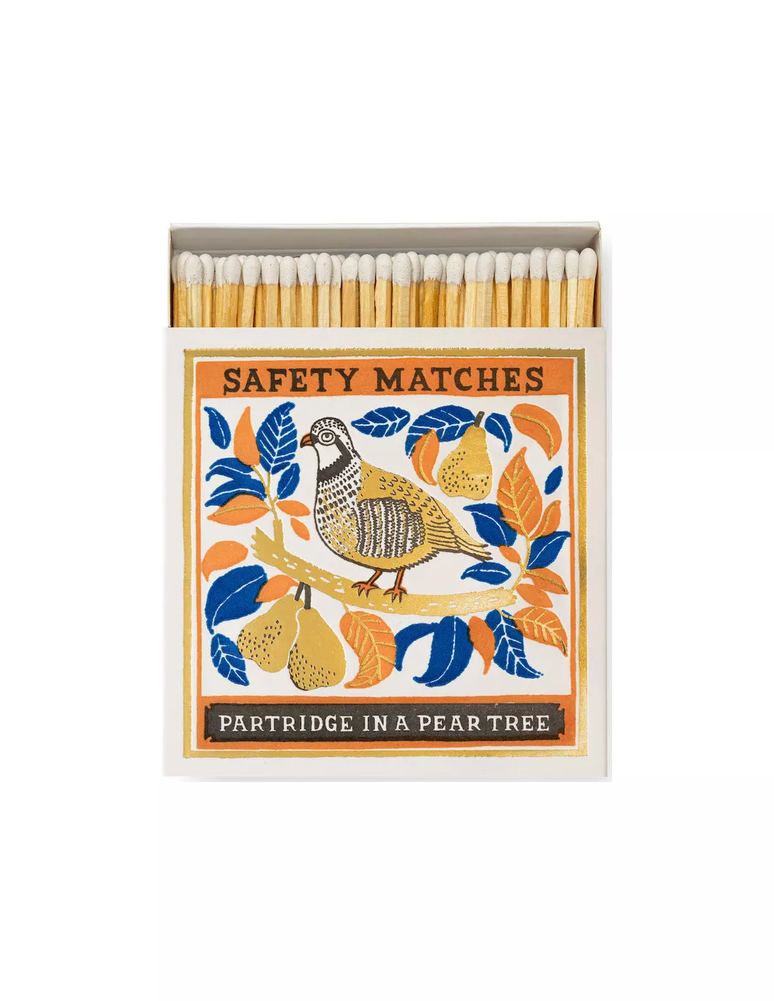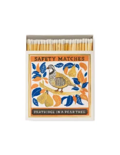Une sublime boite de 125 allumettes aux tons orange et bleu illustrĂ©e d’un perdrix dans un poirier.