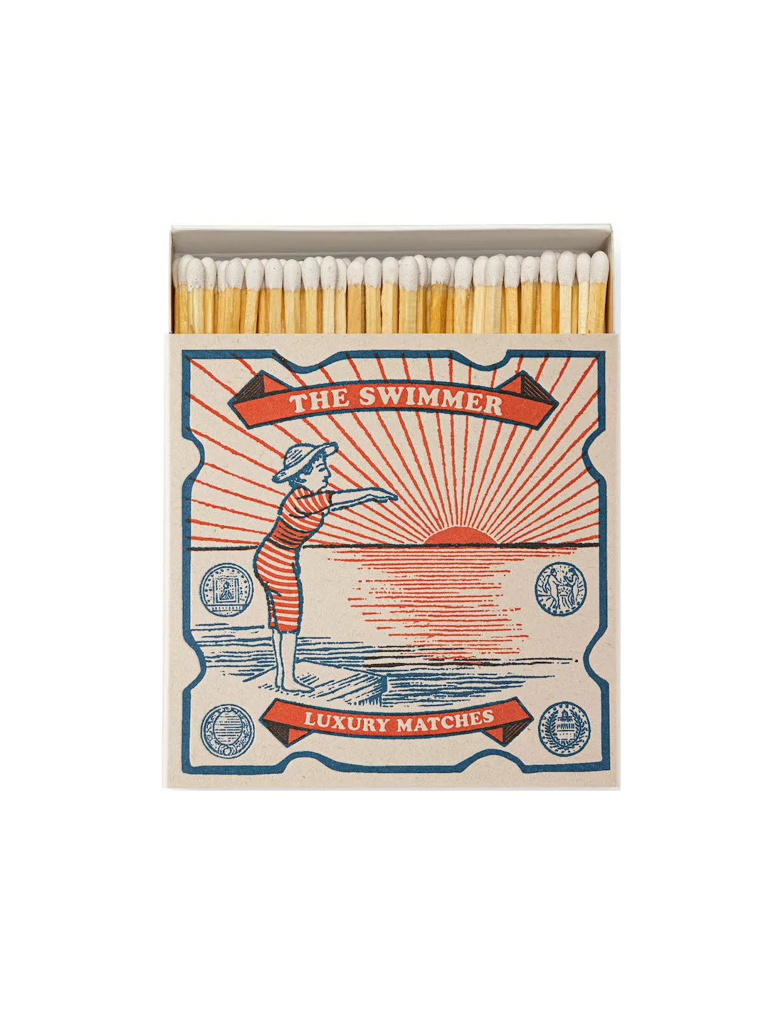 Une sublime boite de 125 allumettes aux tons bleu et rouge illustrĂ©e d’un nageur se prĂ©parant Ă  plonger dans un lac lors du couchĂ© du soleil.