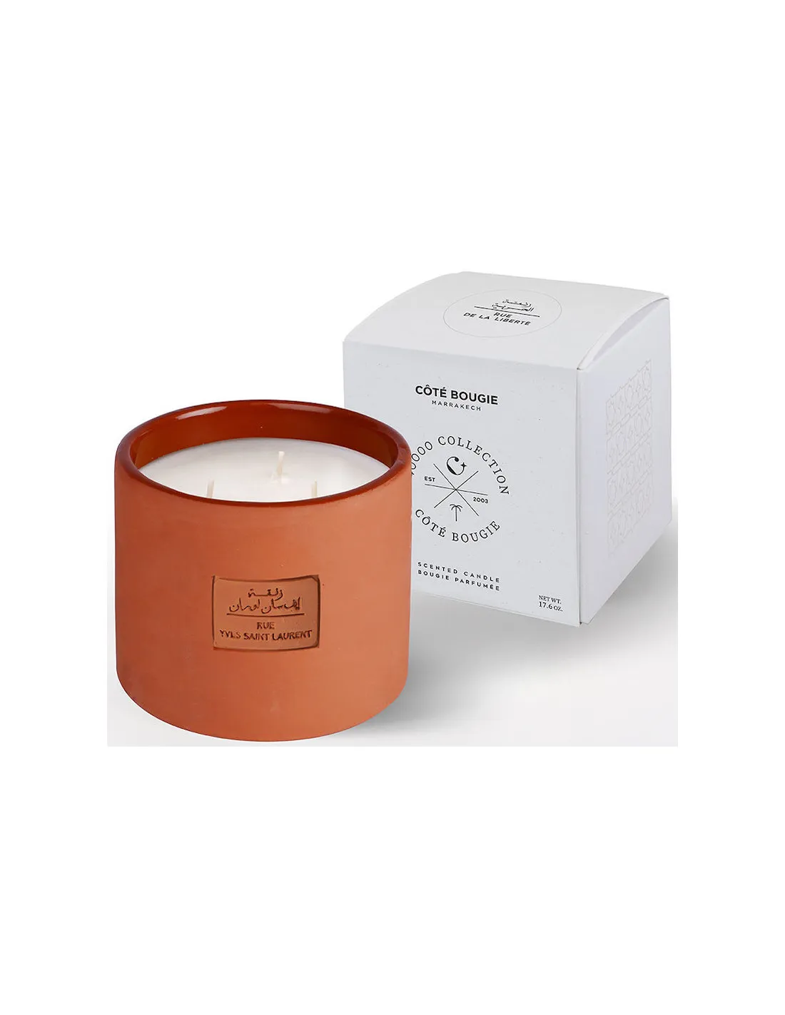Bougie coulée dans un pot en terre cuite fabriqué à la main à Marrakech et livrée dans une superbe boîte cadeau. Dans la même collection « 40.000 Marrakech », retrouvez Place Jemaa El Fna et Rue de la Liberté.