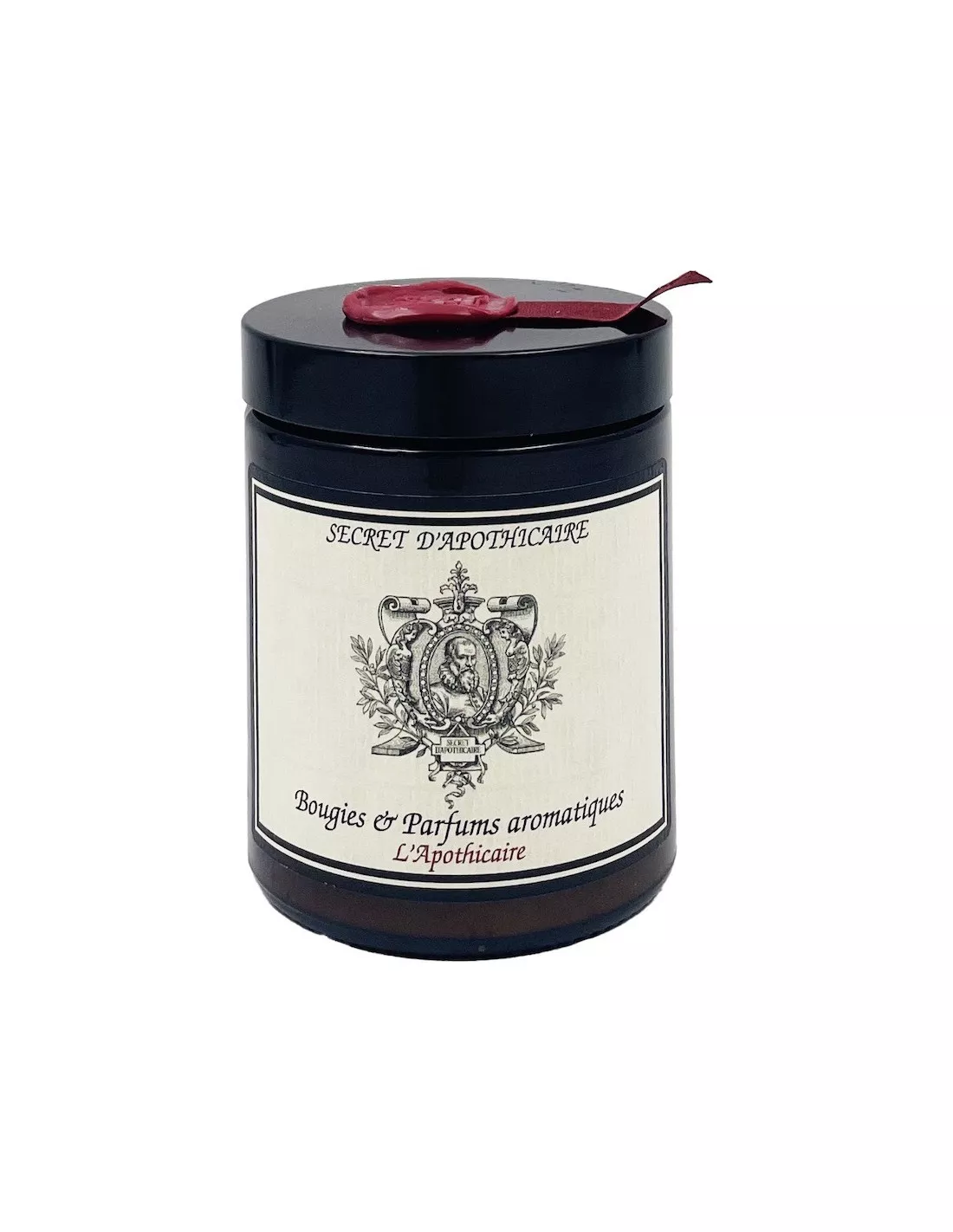 La bougie parfumée L’Apothicaire fait partie de la collection « Apothicaire ». Le pommadier est revêtu de son cachet de cire et de son ruban de couleur rouge foncé.