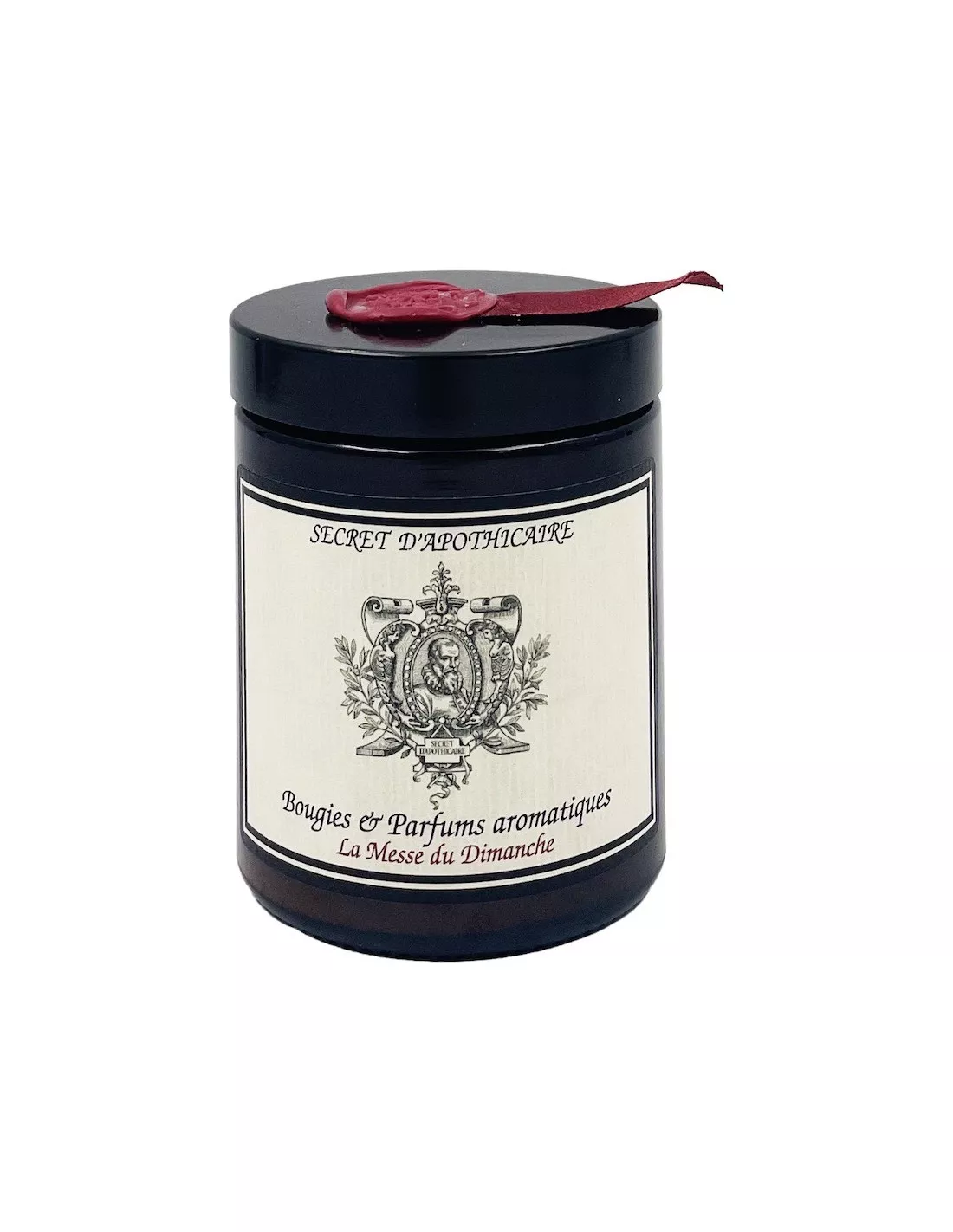 La bougie parfumée La Messe du Dimanche fait partie de la collection « Apothicaire ». Le pommadier est revêtu de son cachet de cire et de son ruban de couleur rouge foncé.