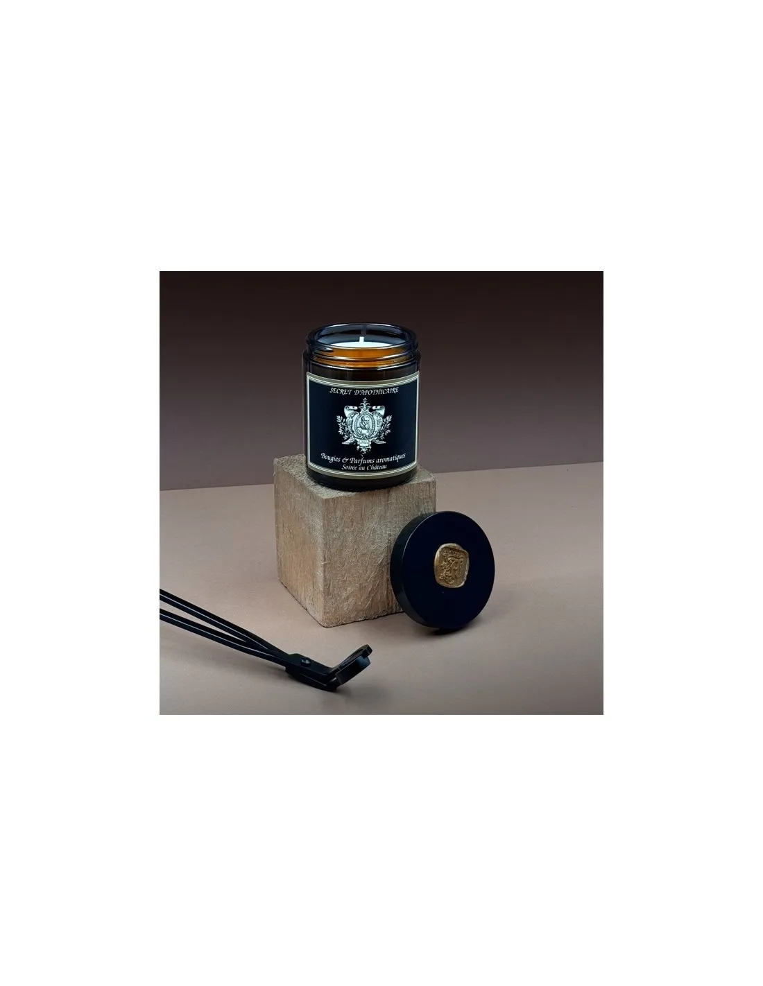 La bougie parfumée Soirée au Château est faite de cire entièrement naturelle coulée dans un pommadier revêtu de son cachet de cire et de son ruban doré.