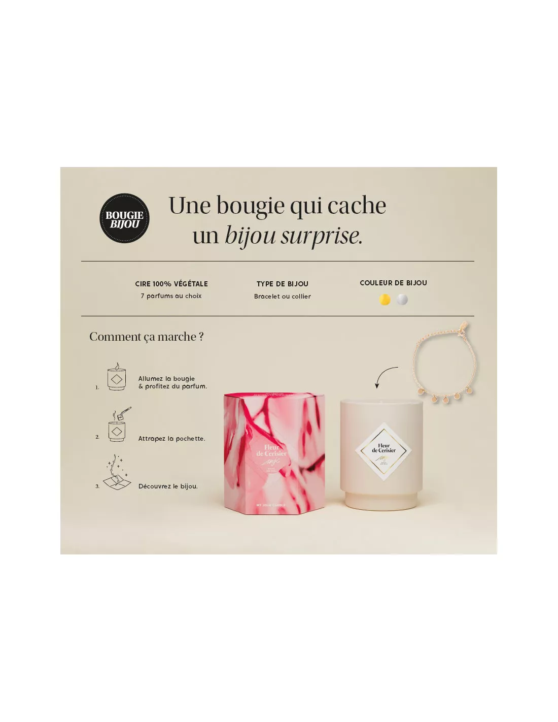 Profitez d’une bougie parfumĂ©e en cire 100% vĂ©gĂ©tale et d’un beau bijou dorĂ©, bracelet ou collier (au choix).