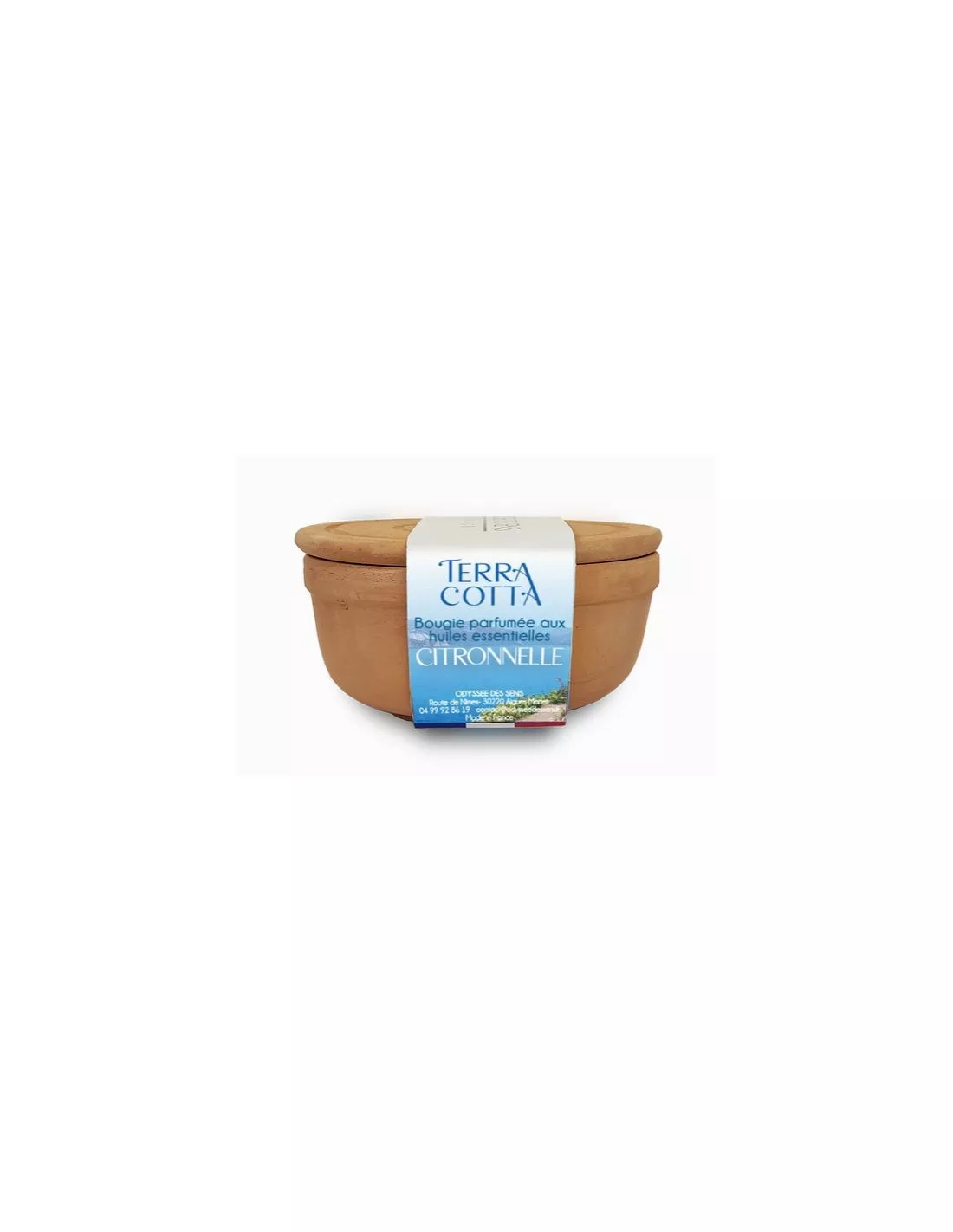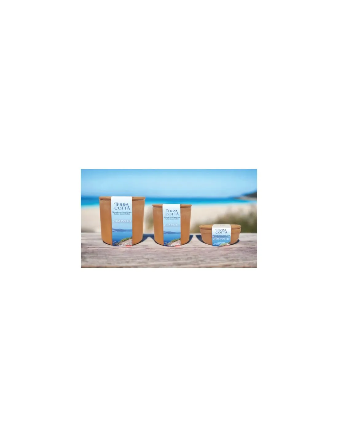 Les bougies d’extĂ©rieur Ă la citronnelle sont coulĂ©es dans un pot artisanal en terre cuite