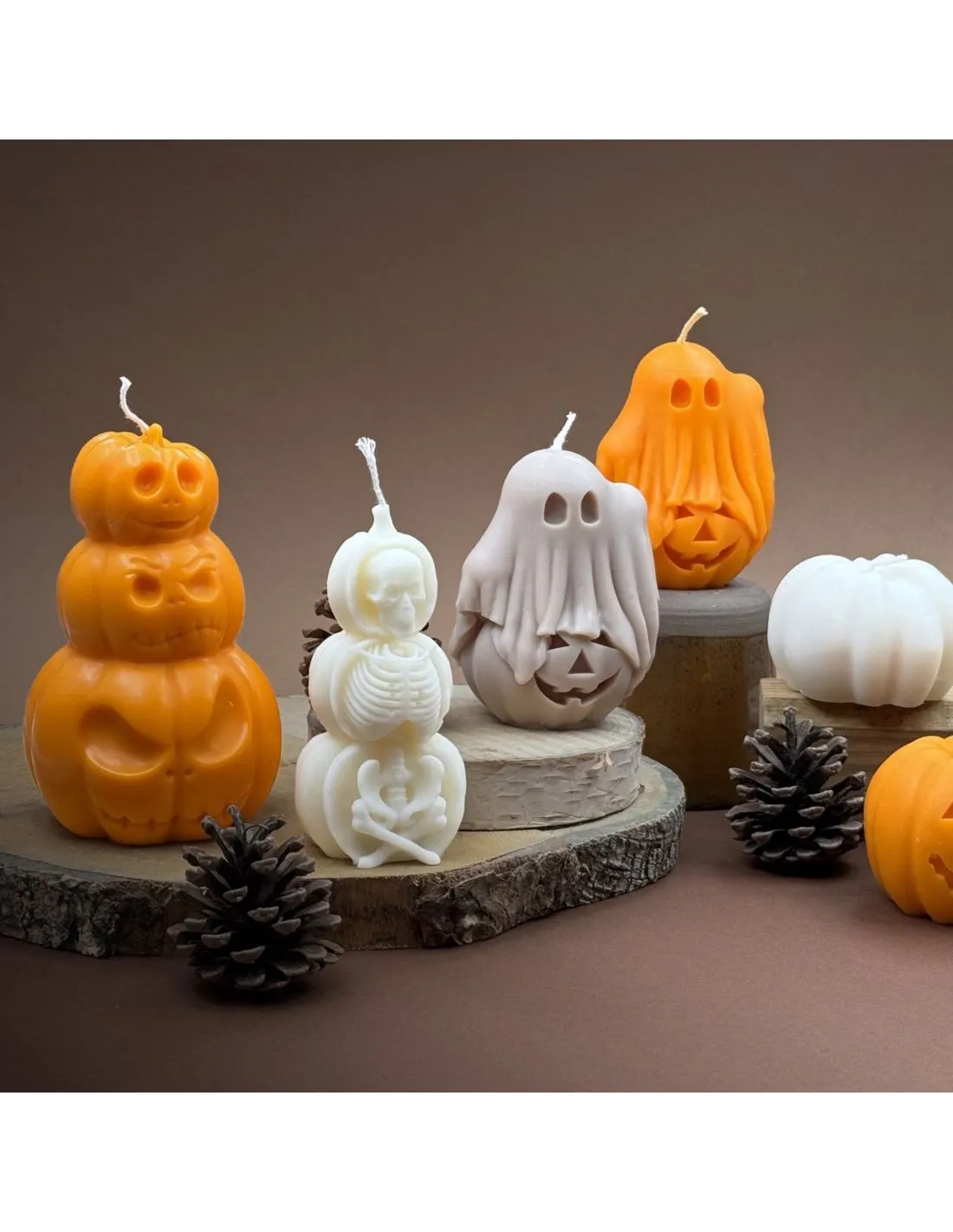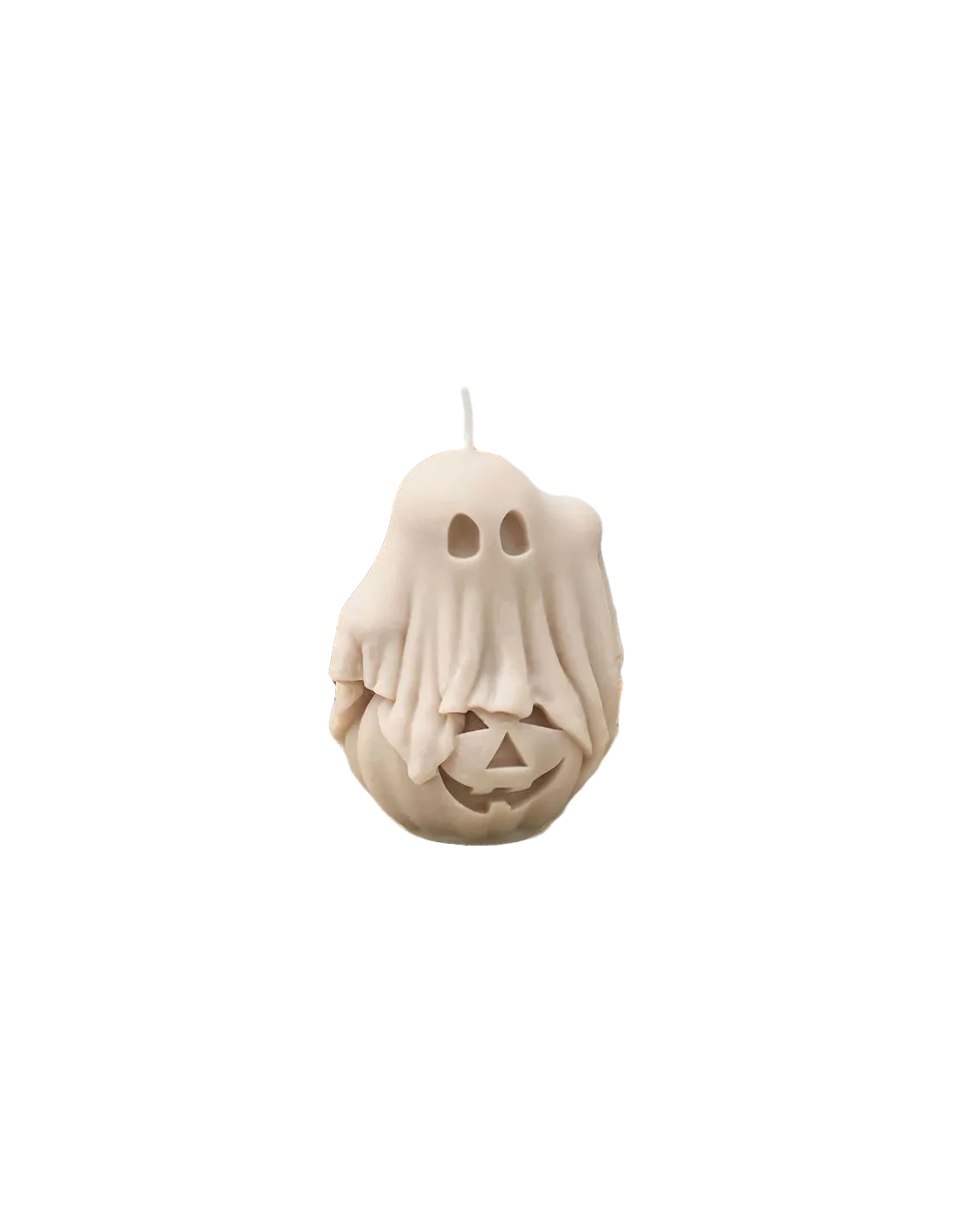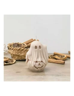 PrĂ©sentant un adorable fantĂ´me de dessin animĂ© au sommet d’une citrouille sculptĂ©e et faisant un petit signe de la main, cette bougie parfumĂ©e ajoute une touche festive d’Halloween.