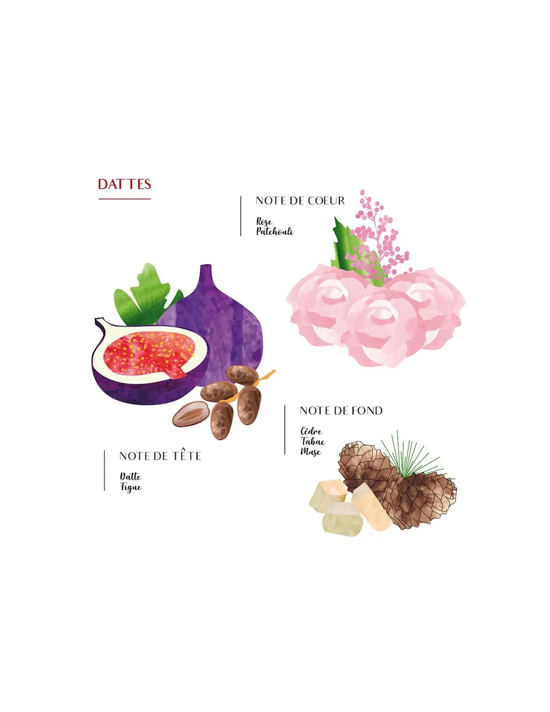 🌴 Parfum Dattes Majestueuses : Un souffle d’élégance inspiré des palmiers dattiers de Marrakech. Les notes sucrées et onctueuses de dattes se mêlent harmonieusement au patchouli, au bois de cèdre et aux accents profonds de tabac et de musc. Une composition olfactive gourmande, boisée et enveloppante qui évoque la chaleur et la richesse des oasis marocaines.