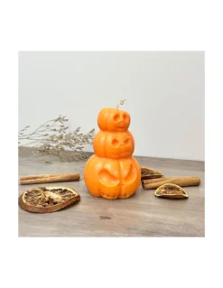 Présentant trois citrouilles sculptées avec des visages effrayants, cette bougie ajoute une touche festive à vos décos d’Halloween.