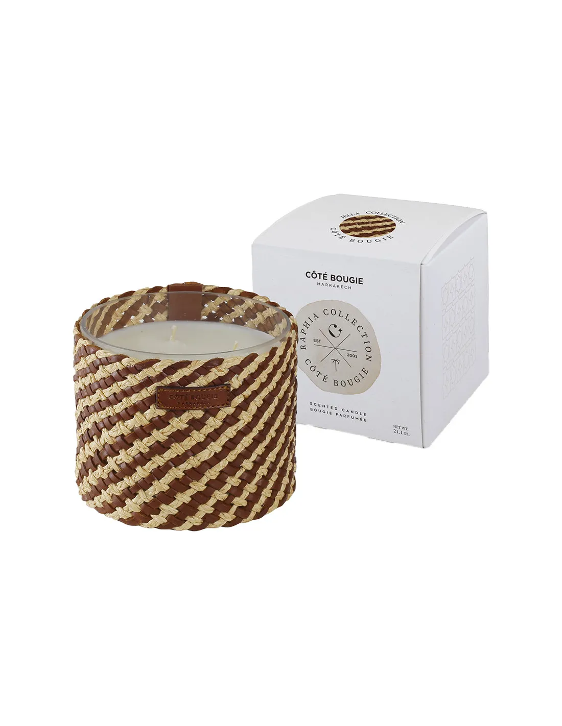 Ce format est unique avec son sublime pot en raphia et cuir tressé le différencie des autres bougies. Véritable objet décoratif, elle apportera à votre intérieur ce cÎté cocooning et diffusera une senteur unique inspirées des tanneries de FÚs et de Marrakech.