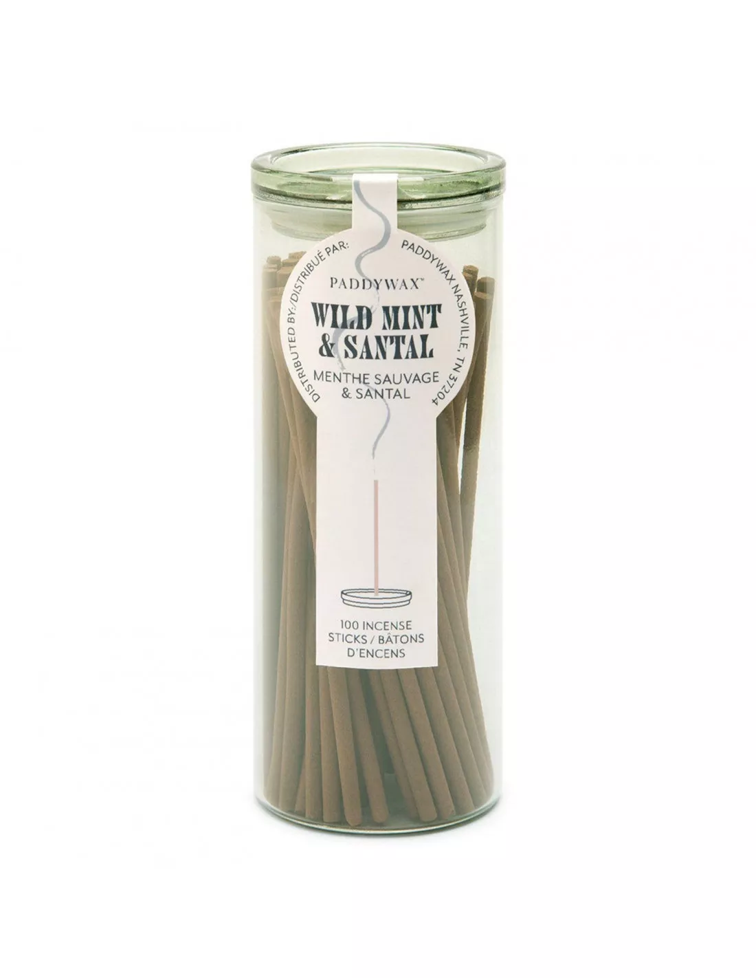 L’encens Paddywax est livré dans un flacon en verre teinté dont le couvercle sert de porte-encens.
