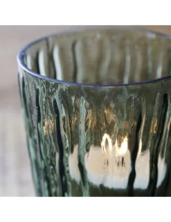 Créez une atmosphère chaleureuse et invitante avec ce photophore en verre de House Doctor. La surface extérieure a été peinte à la bombe pour lui donner une délicate nuance de bleu tandis que les rayures verticales rehaussent la forme et le design.