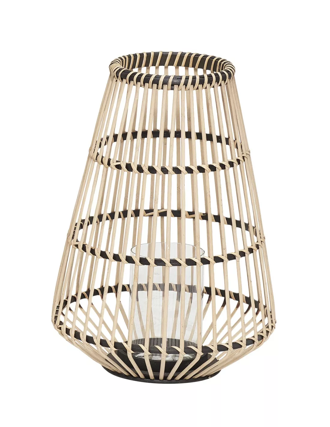 Grande lanterne en bambou et métal noir pour décorer vos extérieurs, terrasses et piscine. Elle est livrée avec une verrerie pour y placer un cierge pour illuminer vos soirées.