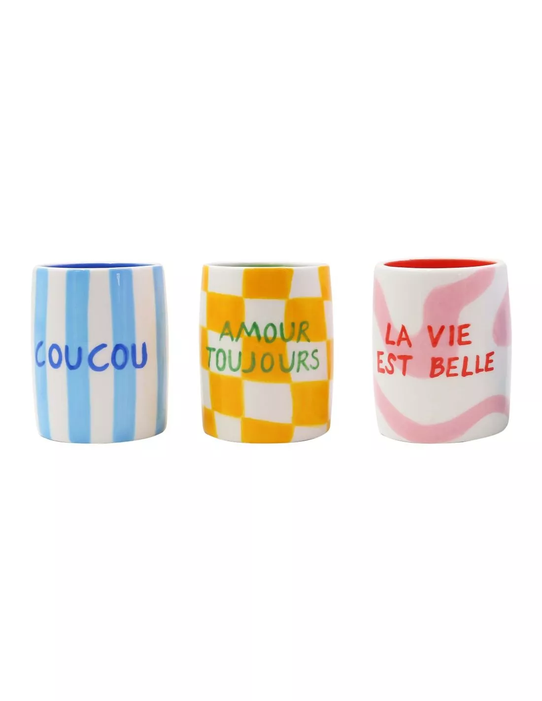 Conçus en Belgique et capturant l’énergie dynamique espagnole, ces gobelets présentent des inscriptions et des motifs animés. Avec leur silhouette cylindrique et leurs palettes de couleurs vives bleu, rose et jaune affichant des phrases telles que « Coucou », « La Vie Est Belle » et « Amour Toujours », ces mugs faits main apportent une touche de joie à chaque gorgée.
