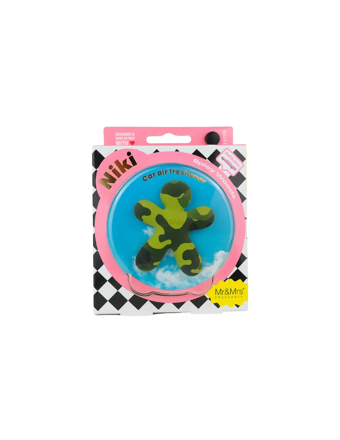 Senteur voiture – Spicy Woods – NIKI : Une fragrance agréable de bois légèrement fumé. Un compagnon aux motifs camouflage, idéal pour parfumer les trajets en voiture.