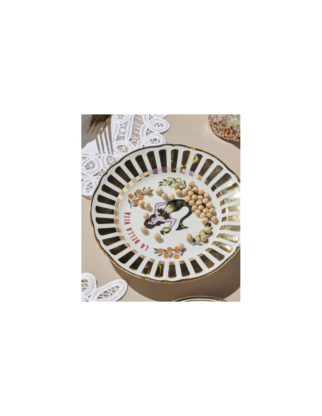 Assiette à dessert en porcelaine magnifique de la marque de design italienne Bitossi Home ornée d’une sirène au centre et entourée de l’inscription « La belle vie ».
