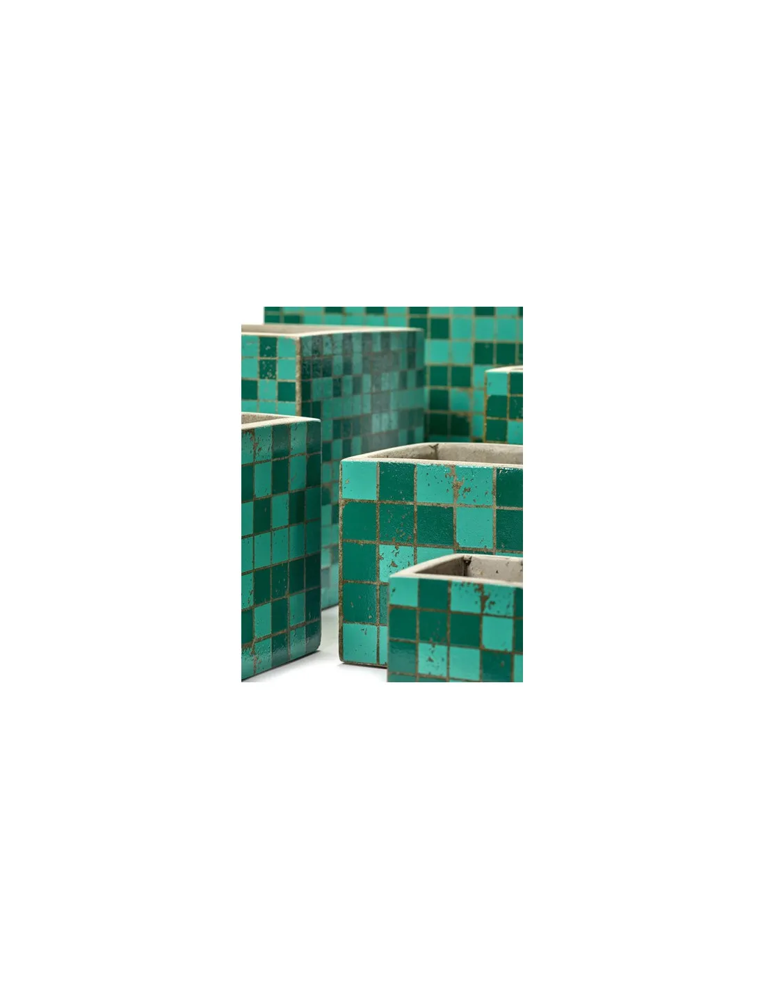 Photophore en ciment, décoré façon mosaïque avec des dégradés de vert. Parfait pour utiliser avec des petites bougies de styles votives ou des bougies lumignons.