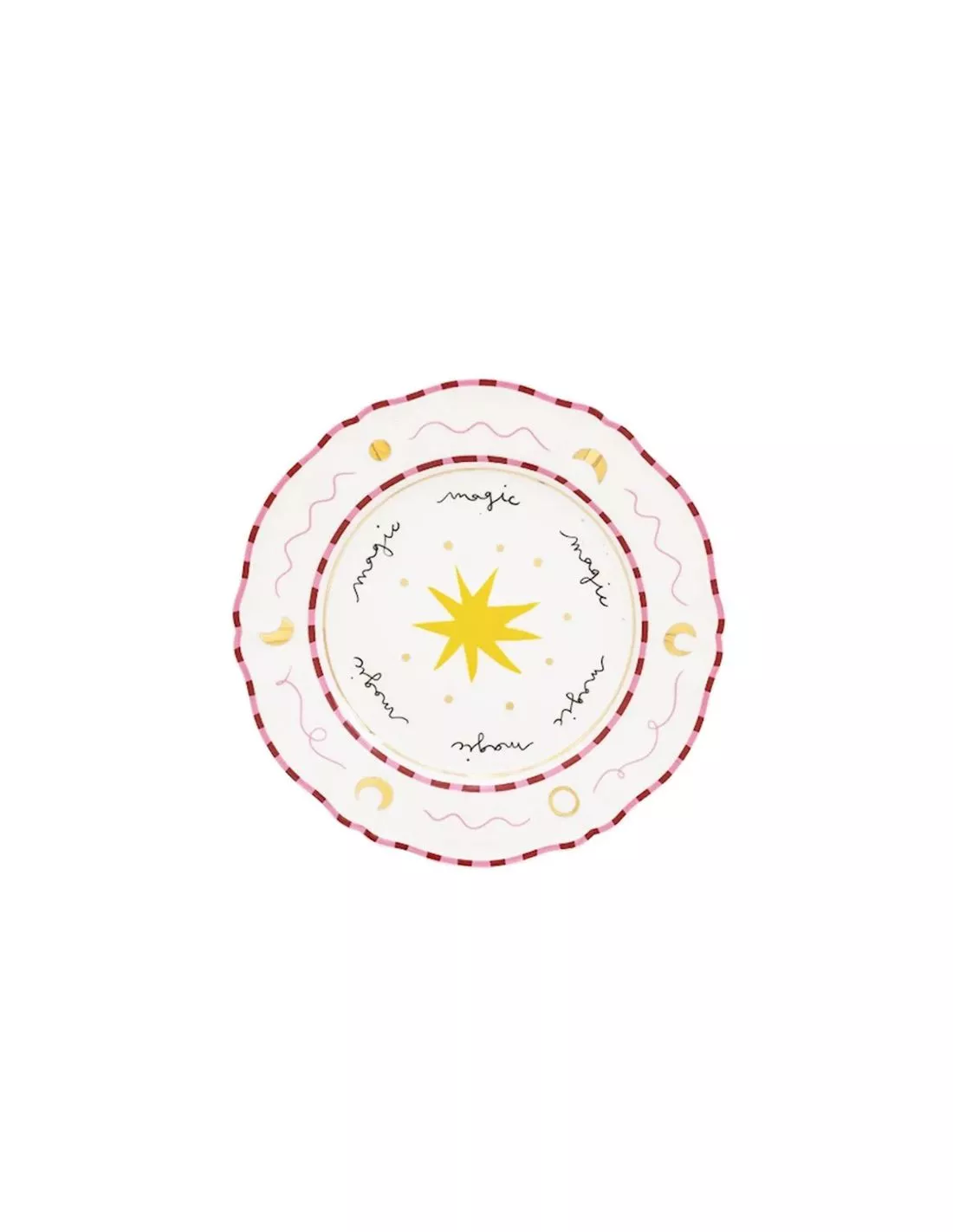 Assiette à dîner en porcelaine magnifique de la marque de design italienne Bitossi Home ornée d’une étoile jaune au centre, entourée de manière ludique par le texte ‘magic’ et d’un bord graphique dans deux nuances de rose.